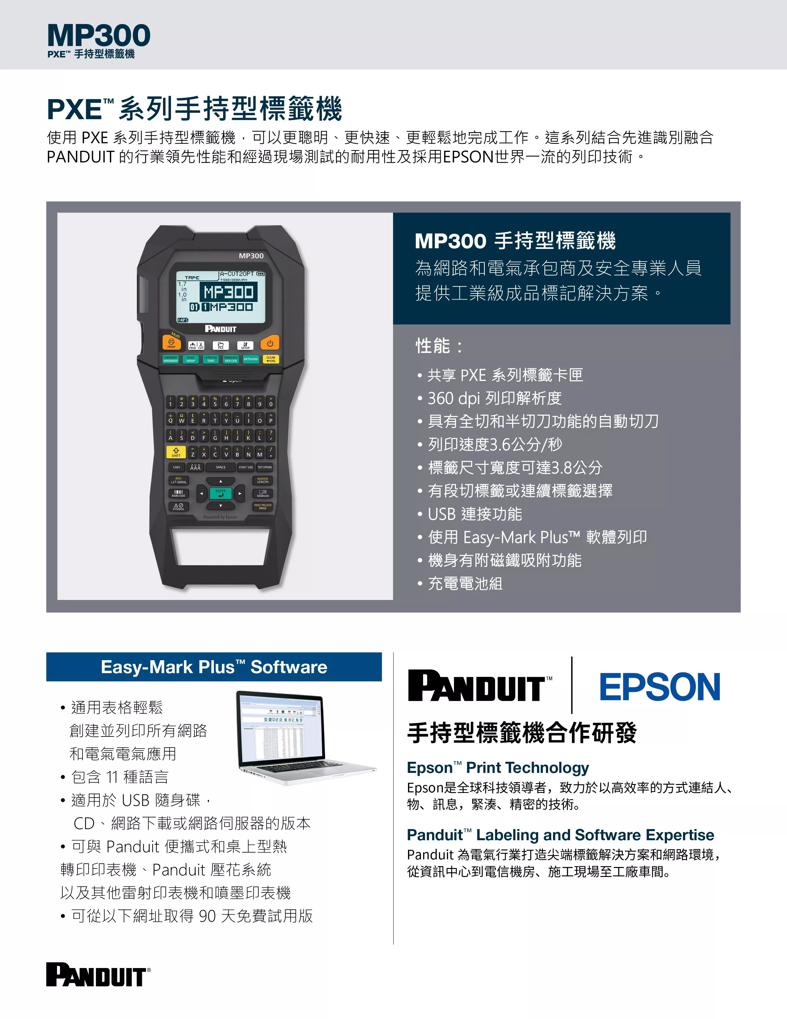 Panduit MP300 手持型標籤機是現場貼標的理想解決方案。我們的印表機提供多種模切和連續標籤尺寸,寬度可達3.8公分,並配有可進行全切和半切的自動切刀。 MP300 具有 360 dpi 的解析度和快速的列印速度,可提高標籤生產效率。印表機配有一個標籤盒、硬式手提箱、可充電電池組、磁性附件、USB 電纜和電源適配器。